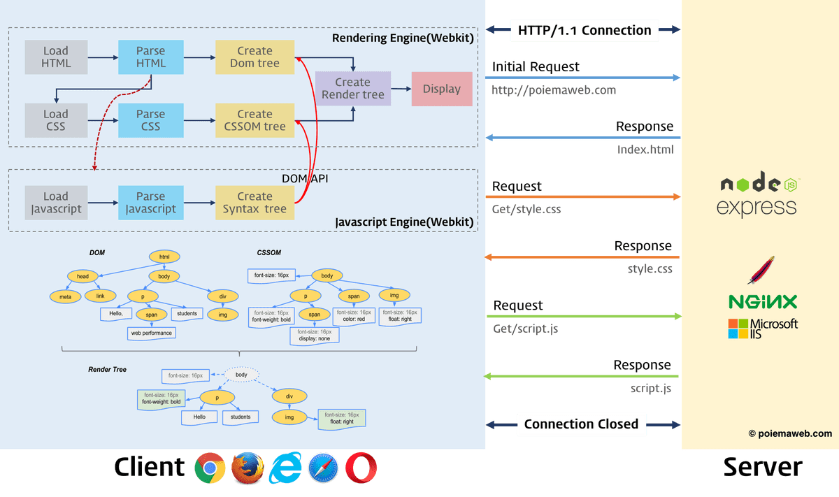- 렌더링 엔진은 서버로부터 응답된 html과 css를 파싱 하여 각각 DOM과 CSSOM를 생성한다.